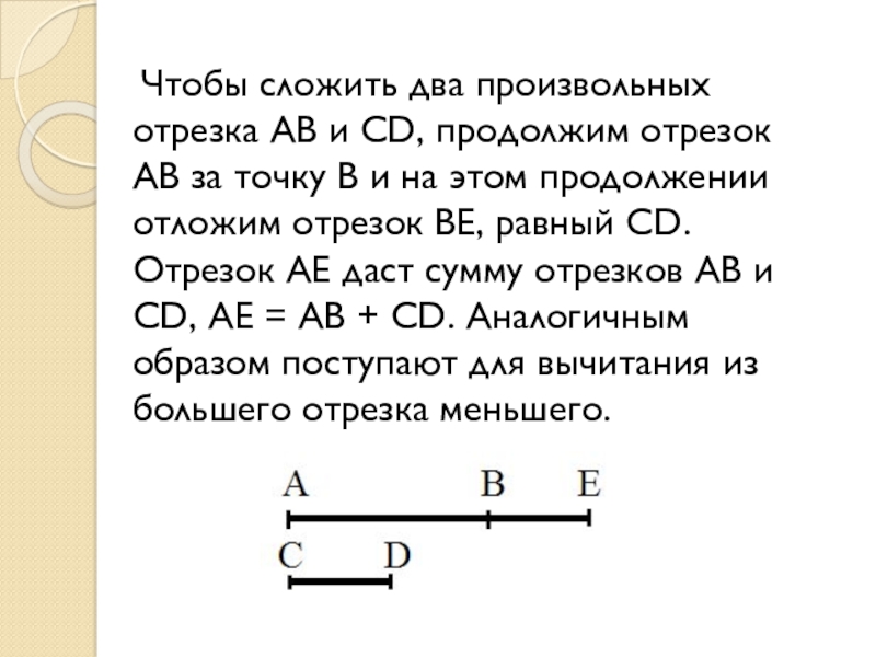 за точку В и на этом продолжении отложим отрезок ВЕ, равный CD. Отрезок АЕ даст сумму отрезков AB и CD, АЕ = AB + CD. Аналогичным образом поступают для вычитания из большего отрезка меньшего.