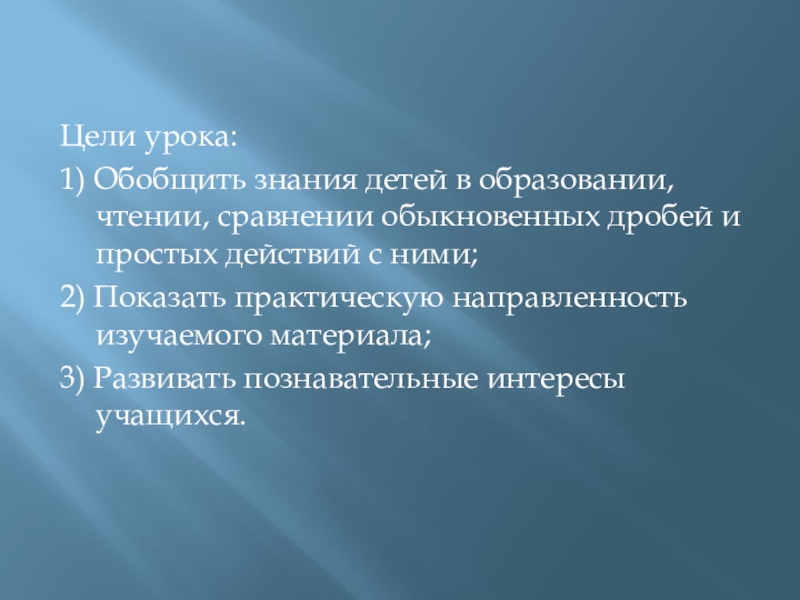Цели урока: 1) Обобщить знания детей в образовании, чтении, сравнении обыкновенных дробей и простых действий с ними;2)
