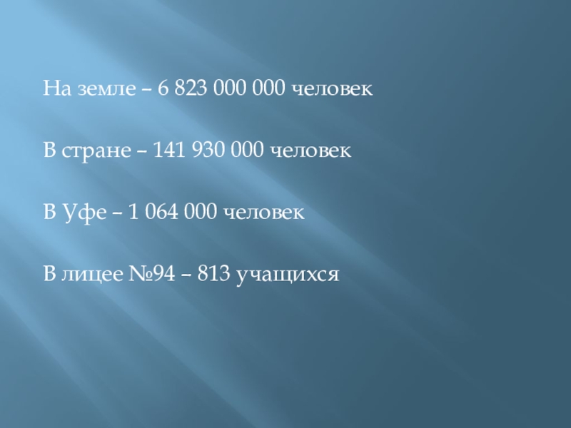 На земле – 6 823 000 000 человекВ стране – 141 930 000 человекВ Уфе – 1