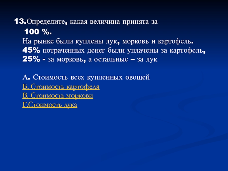 куплены лук, морковь и картофель. 45% потраченных денег были уплачены за картофель, 25% - за морковь, а остальные – за лук А. Стоимость всех купленных овощей Б. Стоимость картофеля В. Стоимость моркови Г.Стоимость лука