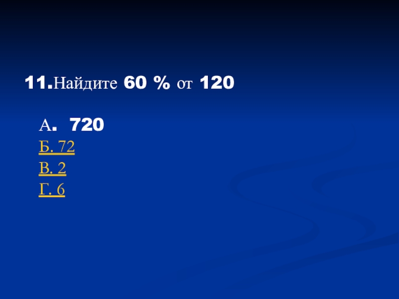 11.Найдите 60 % от 120  А. 720 Б. 72 В. 2 Г. 6