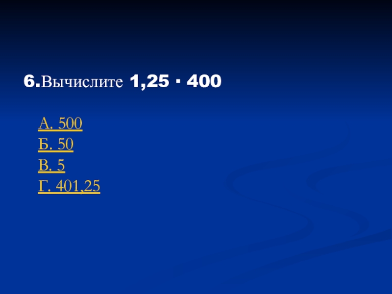 Слайд 126.Вычислите 1,25 ∙ 400 А. 500 Б. 50 В. 5 Г. 401,25