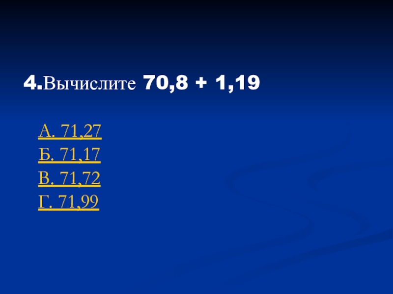 Слайд 84.Вычислите 70,8 + 1,19 А. 71,27 Б. 71,17 В. 71,72 Г. 71,99