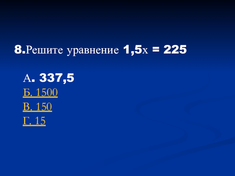 8.Решите уравнение 1,5х = 225  А. 337,5 Б. 1500 В. 150 Г. 15