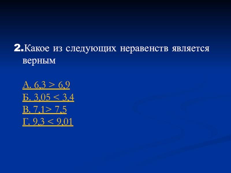Слайд 42.Какое из следующих неравенств является верным А. 6,3 > 6,9 Б. 3,05
