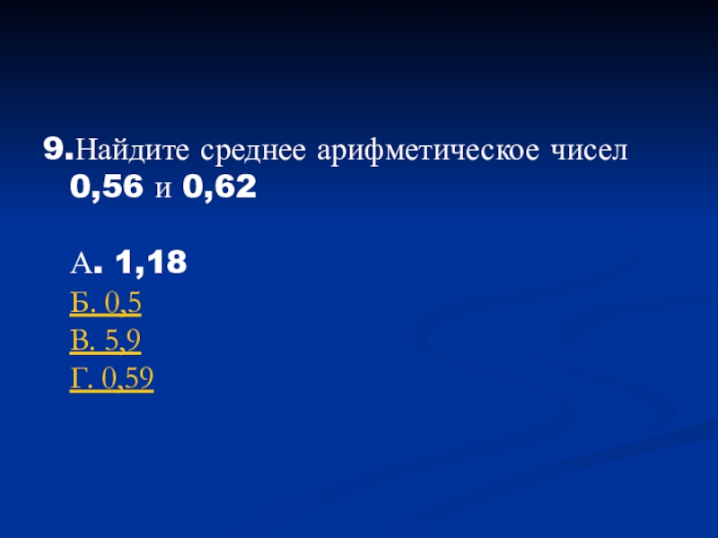 9.Найдите среднее арифметическое чисел 0,56 и 0,62  А. 1,18 Б. 0,5 В. 5,9 Г. 0,59