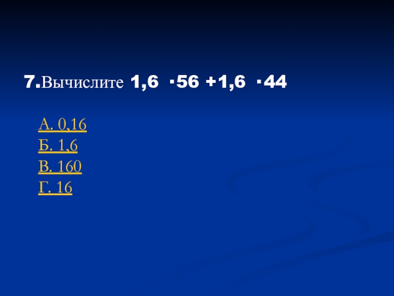 Слайд 147.Вычислите 1,6 · 56 +1,6 · 44 А. 0,16 Б. 1,6 В. 160 Г. 16