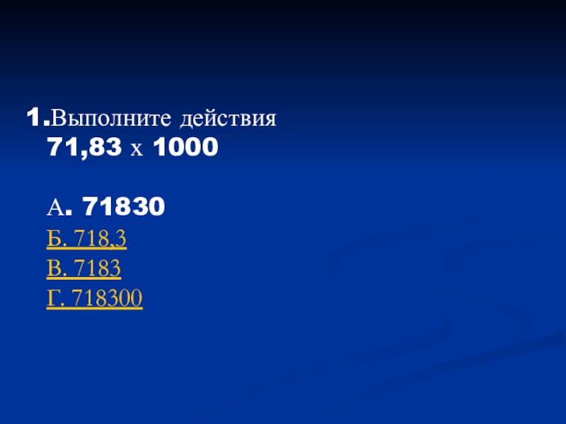 1.Выполните действия 71,83 х 1000 А. 71830 Б. 718,3 В. 7183 Г. 718300