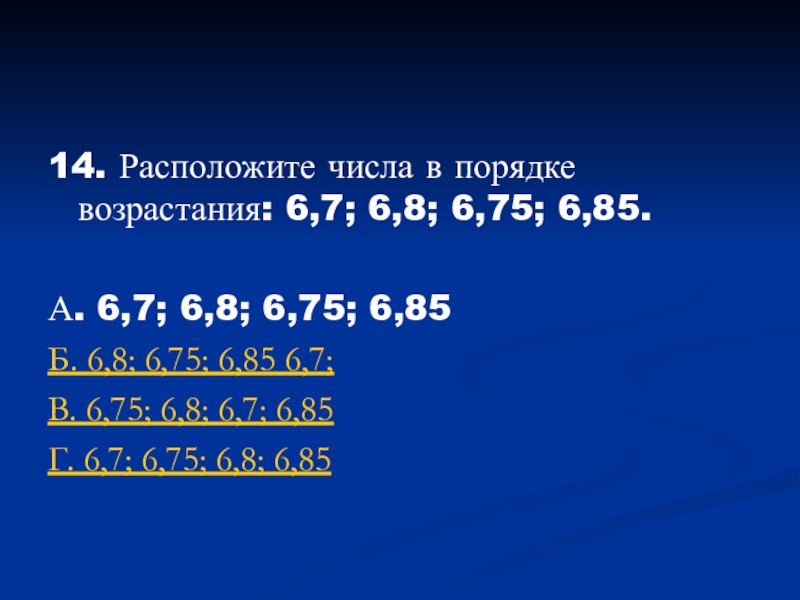 14. Расположите числа в порядке возрастания: 6,7; 6,8; 6,75; 6,85.А. 6,7; 6,8; 6,75; 6,85Б. 6,8; 6,75; 6,85