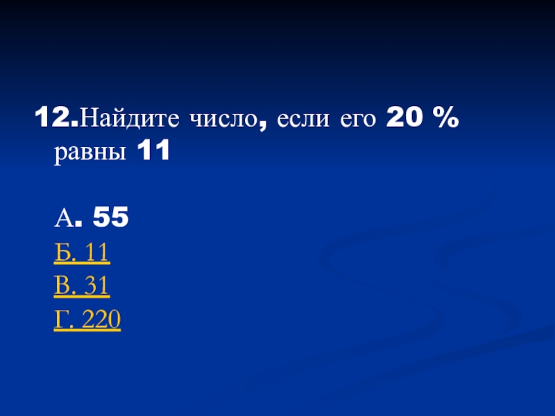 12.Найдите число, если его 20 % равны 11  А. 55 Б. 11 В. 31 Г. 220