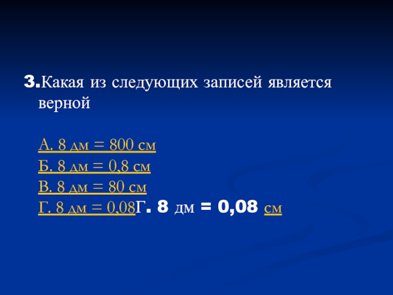 3.Какая из следующих записей является верной  А. 8 дм = 800 см Б. 8 дм =