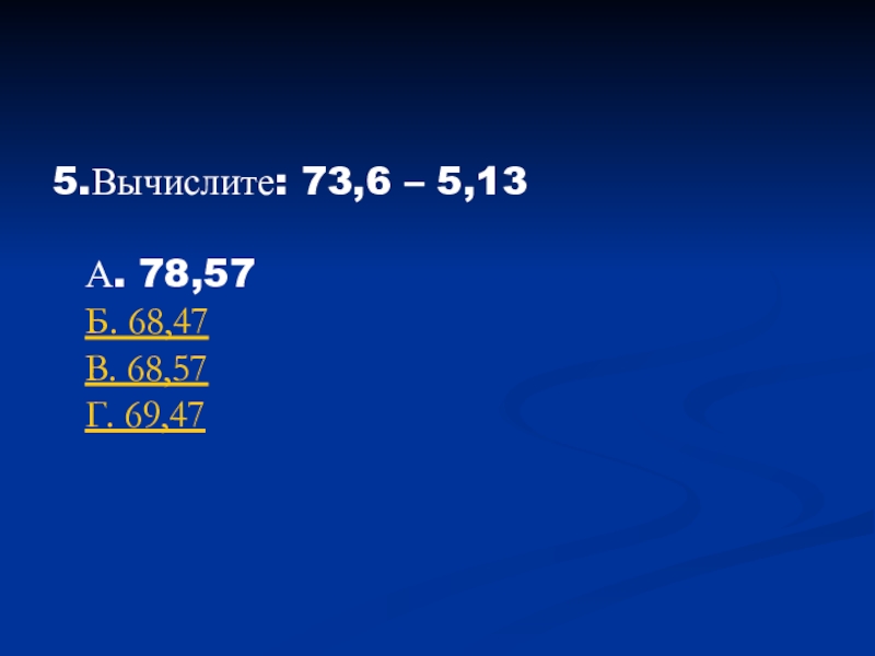 Слайд 105.Вычислите: 73,6 – 5,13 А. 78,57 Б. 68,47 В. 68,57 Г. 69,47