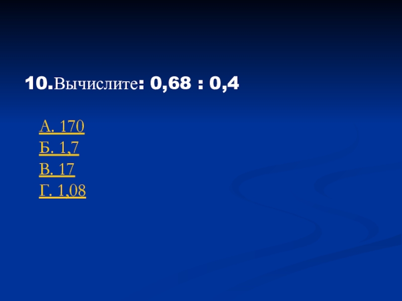 Слайд 2010.Вычислите: 0,68 : 0,4 А. 170 Б. 1,7 В. 17 Г. 1,08