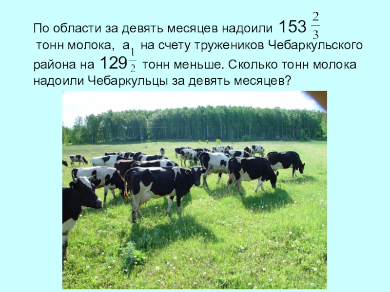По области за девять месяцев надоили 153 тонн молока, а на счету тружеников Чебаркульского района на 129 тонн меньше. Сколько тонн молока надоили Чебаркульцы за девять месяцев?
