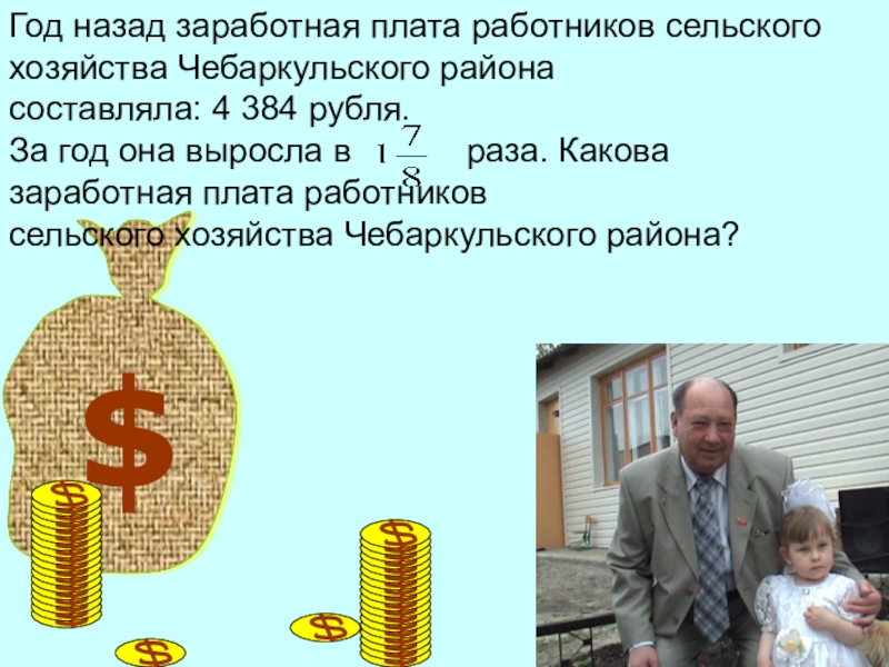 $Год назад заработная плата работников сельского хозяйства Чебаркульского района составляла: 4 384 рубля. За год она выросла