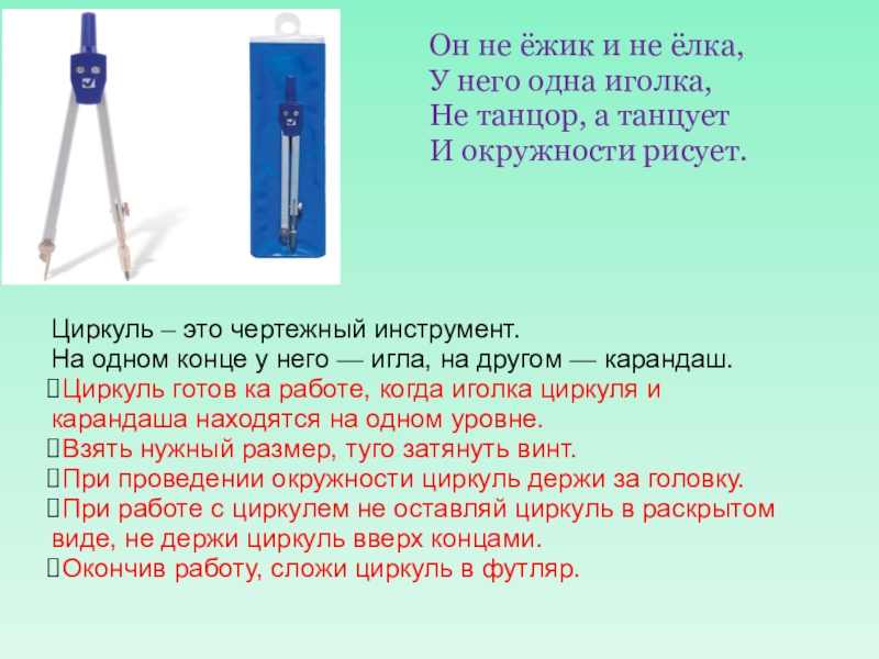 При работе с циркулем не оставляй циркуль в раскрытом виде, не держи циркуль вверх концами.