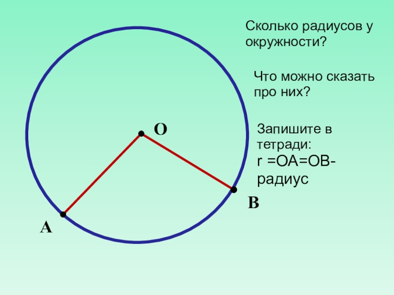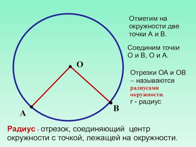 Радиус - отрезок, соединяющий центр окружности с точкой, лежащей на окружности.