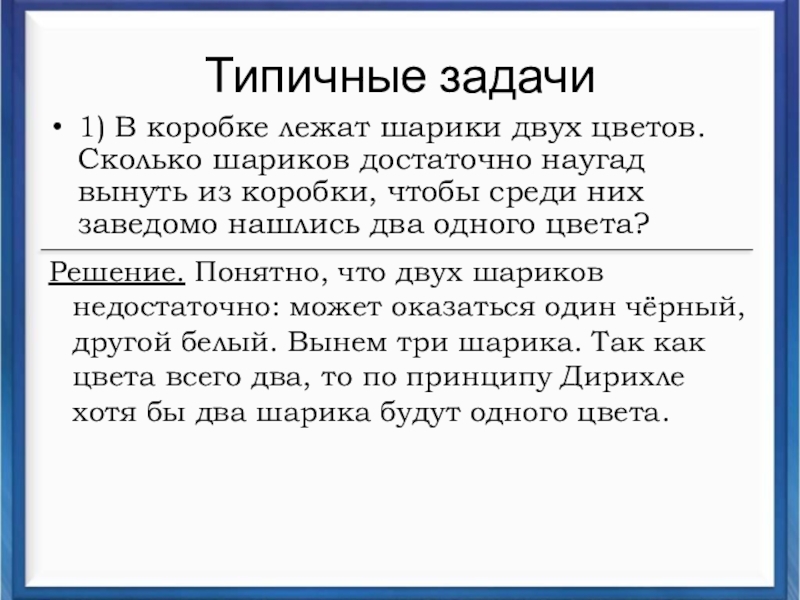 Решение. Понятно, что двух шариков недостаточно: может оказаться один чёрный, другой белый. Вынем три шарика. Так как цвета всего два, то по принципу Дирихле хотя бы два шарика будут одного цвета.