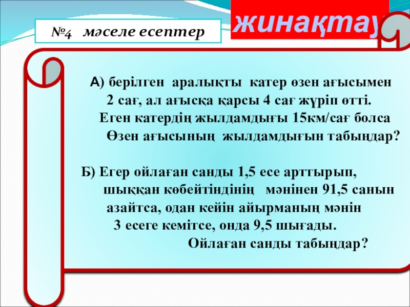 ?жинақтау  А) берілген аралықты катер өзен ағысымен     2 сағ, ал ағысқа қарсы