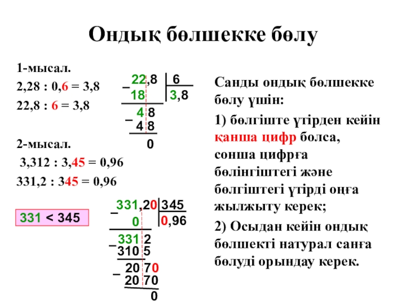 1) бөлгіште үтірден кейін қанша цифр болса, сонша цифрға бөлінгіштегі және бөлгіштегі үтірді оңға жылжыту керек;