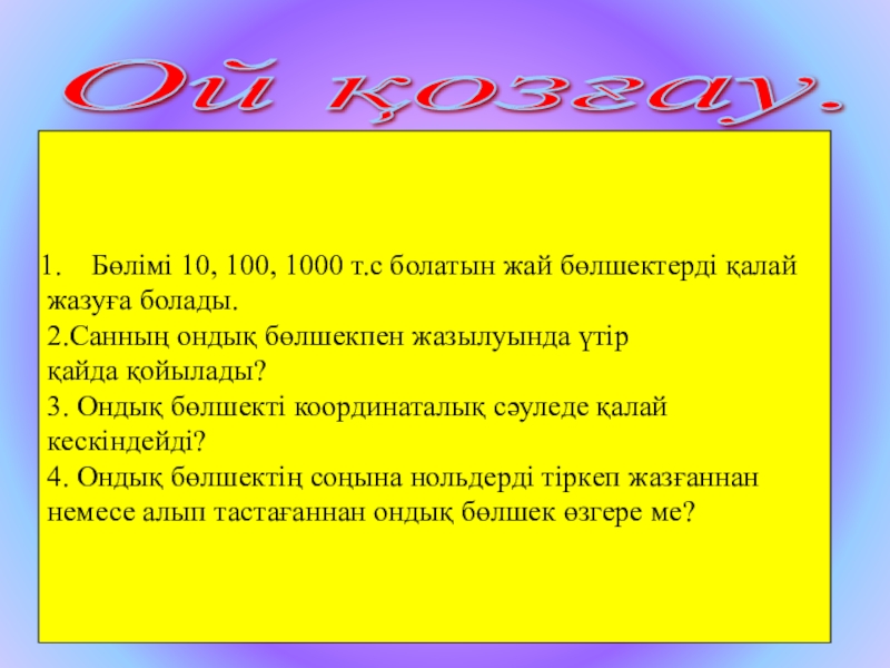Ой қозғау. Бөлімі 10, 100, 1000 т.с болатын жай бөлшектерді қалай жазуға болады.2.Санның ондық бөлшекпен жазылуында үтір