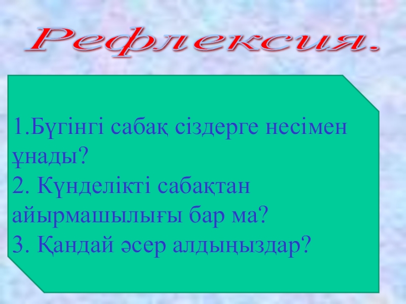 Рефлексия. 1.Бүгінгі сабақ сіздерге несімен ұнады?2. Күнделікті сабақтан айырмашылығы бар ма?3. Қандай әсер алдыңыздар?