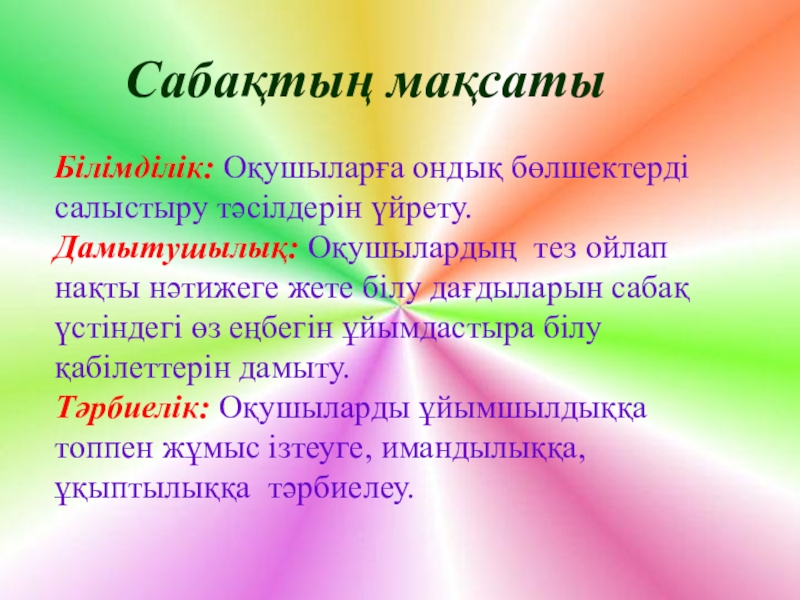 Сабақтың мақсатыБілімділік: Оқушыларға ондық бөлшектерді салыстыру тәсілдерін үйрету.Дамытушылық: Оқушылардың тез ойлап нақты нәтижеге жете білу дағдыларын сабақ үстіндегі өз еңбегін ұйымдастыра білу қабілеттерін дамыту.Тәрбиелік: Оқушыларды ұйымшылдыққа топпен жұмыс ізтеуге, имандылыққа, ұқыптылыққа тәрбиелеу.