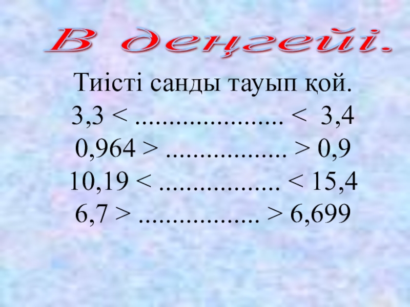 В деңгейі. Тиісті санды тауып қой.3,3 < ...................... < 3,40,964 > .................. > 0,910,19 < ..................