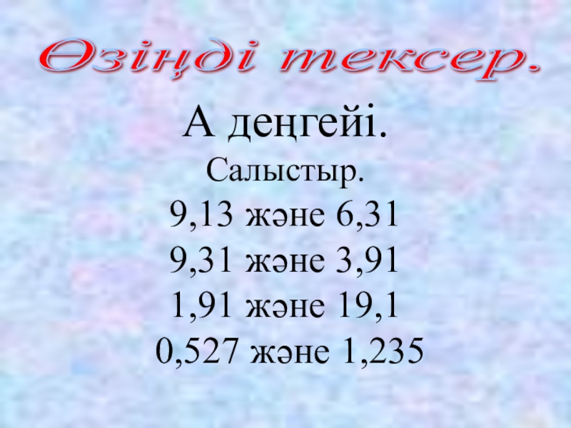 Өзіңді тексер. А деңгейі.Салыстыр.9,13 және 6,319,31 және 3,911,91 және 19,1 0,527 және 1,235