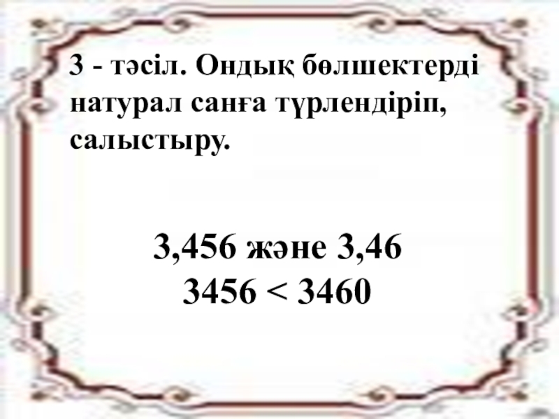3 - тәсіл. Ондық бөлшектерді натурал санға түрлендіріп, салыстыру.3 - тәсіл. Ондық бөлшектерді натурал санға түрлендіріп, салыстыру.3,456