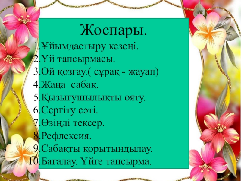 Жоспары.Ұйымдастыру кезеңі.Үй тапсырмасы.Ой қозғау.( сұрақ - жауап)Жаңа сабақ.Қызығушылықты ояту.Сергіту сәті.Өзіңді тексер.Рефлексия.Сабақты қорытындылау.Бағалау. Үйге тапсырма.
