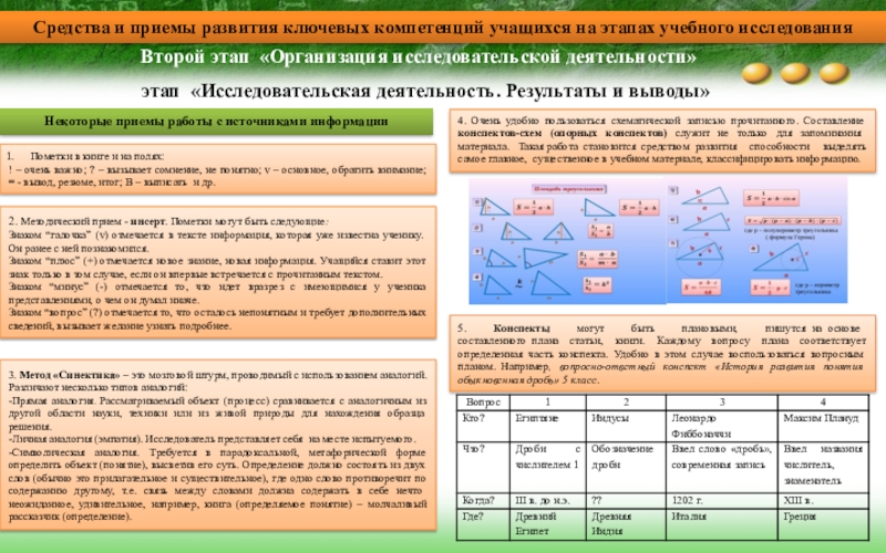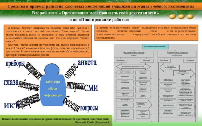 Для того, чтобы усилить их устойчивость, нужно присоединить к каждой "ножке" ключевые слова или фразы, которые служат опорой для памяти. В таком виде можно описать методы сбора информации, критерии оценки результата работы.