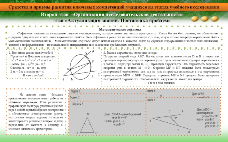 Софизмом называется умышленно ложное умозаключение, которое имеет видимость правильного. Каков бы ни был софизм, он обязательно содержит одну или несколько замаскированных ошибок. Роль софизмов в развитии математики сходна с ролью, какую играют непреднамеренные ошибки в математических исследованиях. Математические софизмы могут использоваться в качестве задач со скрытой информативной частью или ошибками, заданий с информационно – познавательной направленностью, в качестве проблемных ситуаций.
