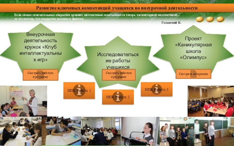 Возможности сети Интернет сегодня трудно переоценить. Там можно найти всю (практически всю) интересующую вас информацию. Можно предложить задания типа: «С помощью сети Интернет найдите любую информацию о математиках». Затем провести лекторий по теме «Великие математики», где дети смогут предоставить тот материал, который им удалось найти. Таким образом, главной компетентностной задачей будет не только изучение истории математики, но и становление (или совершенствование) умений работы с информационными ресурсами.