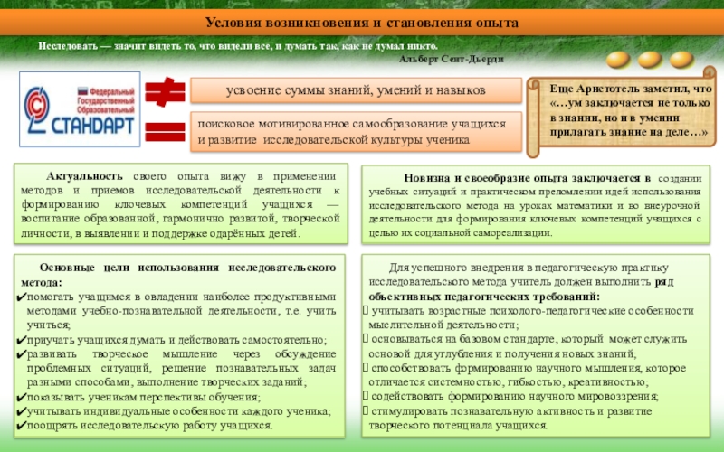 Для успешного внедрения в педагогическую практику исследовательского метода учитель должен выполнить ряд объективных педагогических требований: