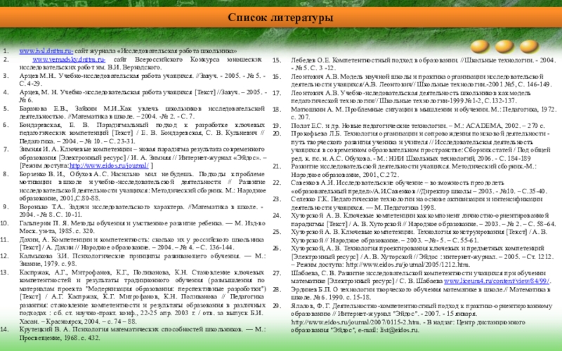 Шабаева, С. В. Развитие исследовательской компетентности учащихся при обучении математике [Электронный ресурс] / С. В. Шабаева www.liceum4.ru/content/view/84/99/.