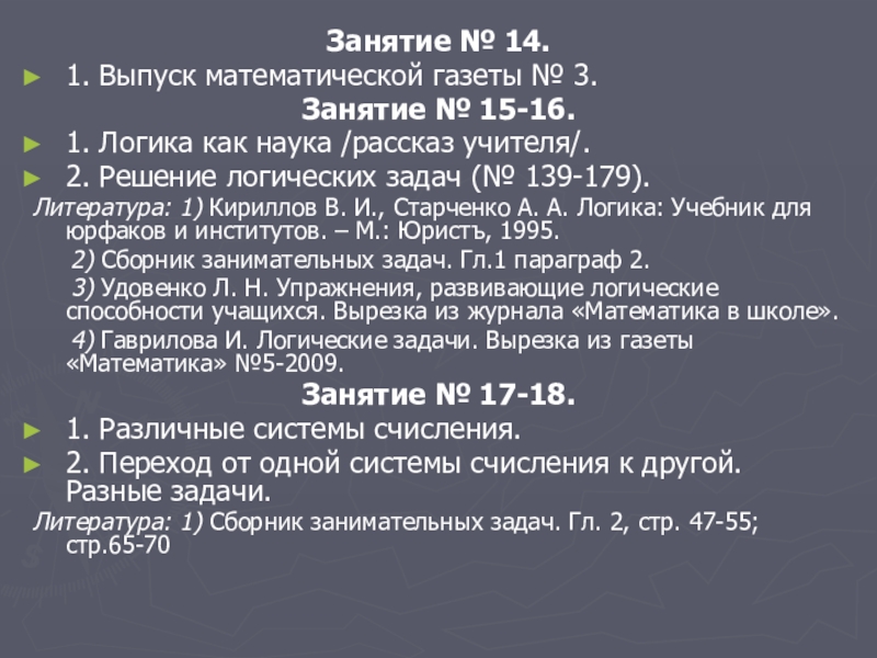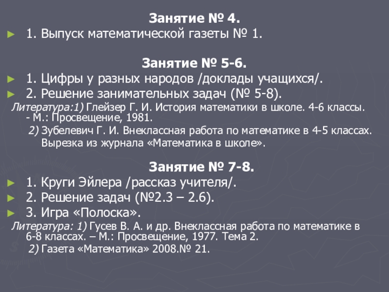 Литература: 1) Гусев В. А. и др. Внеклассная работа по математике в 6-8 классах. – М.: Просвещение, 1977. Тема 3-4.
