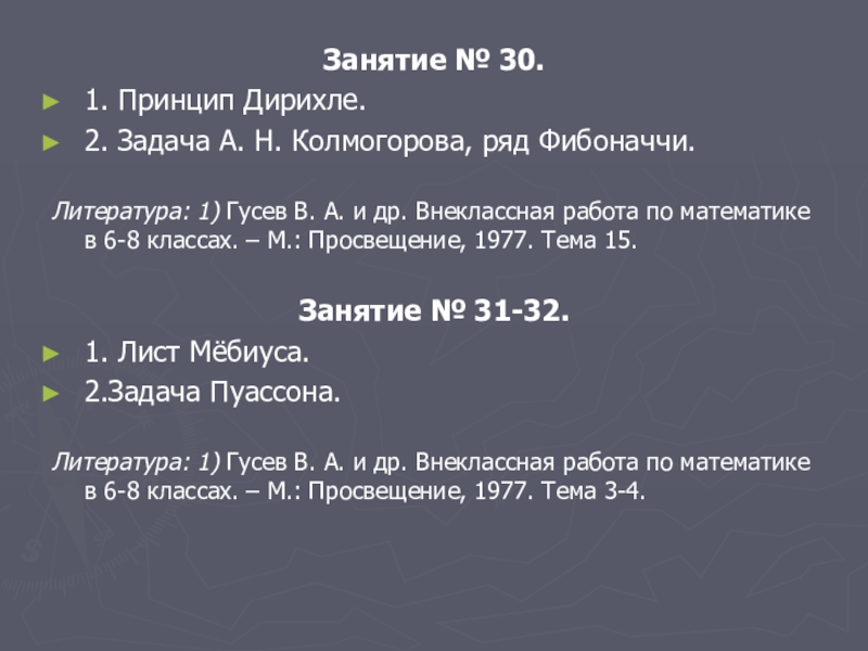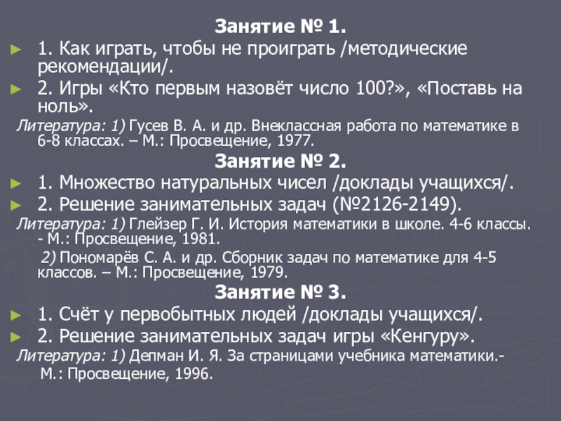 Литература: 1) Гусев В. А. и др. Внеклассная работа по математике в 6-8 классах. – М.: Просвещение, 1977.