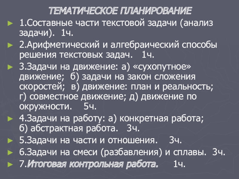 3.Задачи на движение: а) «сухопутное» движение; б) задачи на закон сложения скоростей; в) движение: план и реальность; г) совместное движение; д) движение по окружности. 5ч.