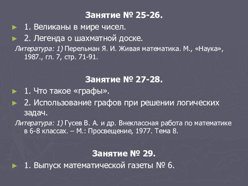 1) Гусев В. А. и др. Внеклассная работа по математике в 6-8 классах. – М.: Просвещение, 1977. Тема 15.