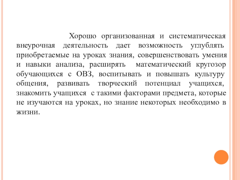 деятельность дает возможность углублять приобретаемые на уроках знания, совершенствовать умения и навыки анализа, расширять математический кругозор обучающихся с ОВЗ, воспитывать и повышать культуру общения, развивать творческий потенциал учащихся, знакомить учащихся с такими факторами предмета, которые не изучаются на уроках, но знание некоторых необходимо в жизни.