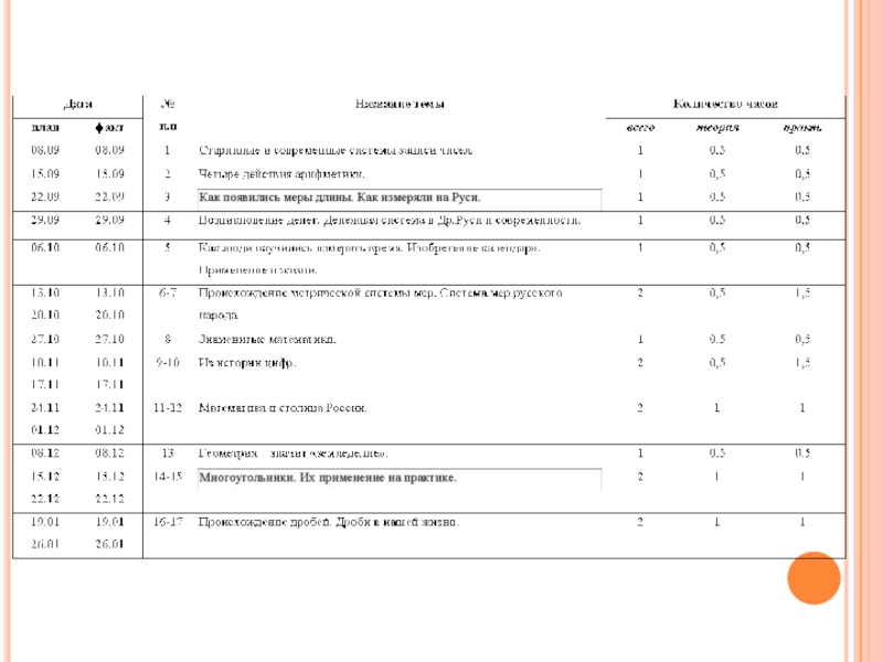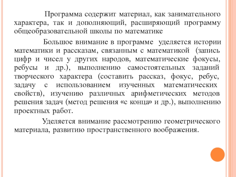 Большое внимание в программе уделяется истории математики и рассказам, связанным с математикой (запись цифр и чисел у других народов, математические фокусы, ребусы и др.), выполнению самостоятельных заданий творческого характера (составить рассказ, фокус, ребус, задачу с использованием изученных математических свойств), изучению различных арифметических методов решения задач (метод решения «с конца» и др.), выполнению проектных работ.