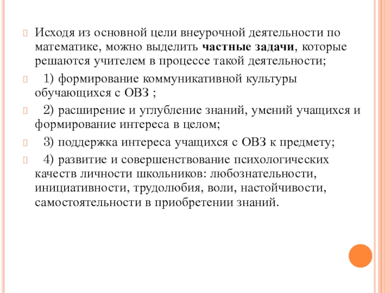 Слайд 5Исходя из основной цели внеурочной деятельности по математике, можно выделить частные
