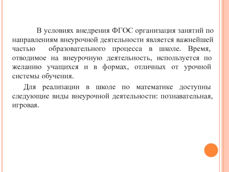 Для реализации в школе по математике доступны следующие виды внеурочной деятельности: познавательная, игровая.