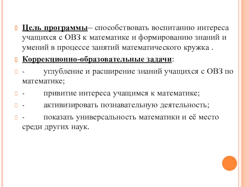 Цель программы– способствовать воспитанию интереса учащихся с ОВЗ к математике