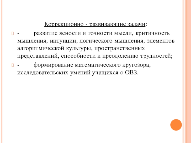 - формирование математического кругозора, исследовательских умений учащихся с ОВЗ.