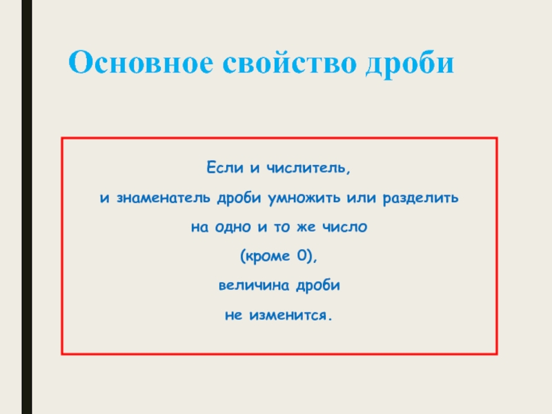 Основное свойство дробиЕсли и числитель, и знаменатель дроби умножить или разделить на одно и то же число