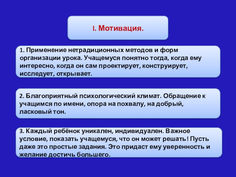2. Благоприятный психологический климат. Обращение к учащимся по имени, опора на похвалу, на добрый, ласковый тон.