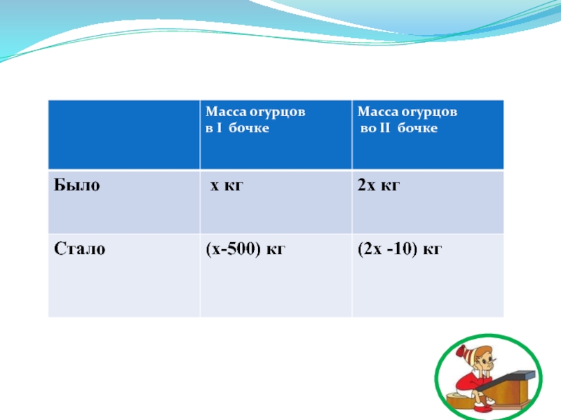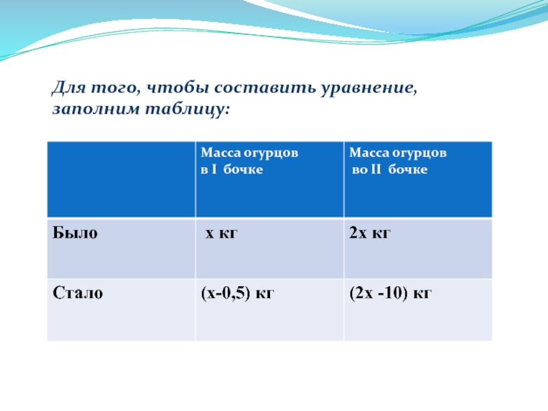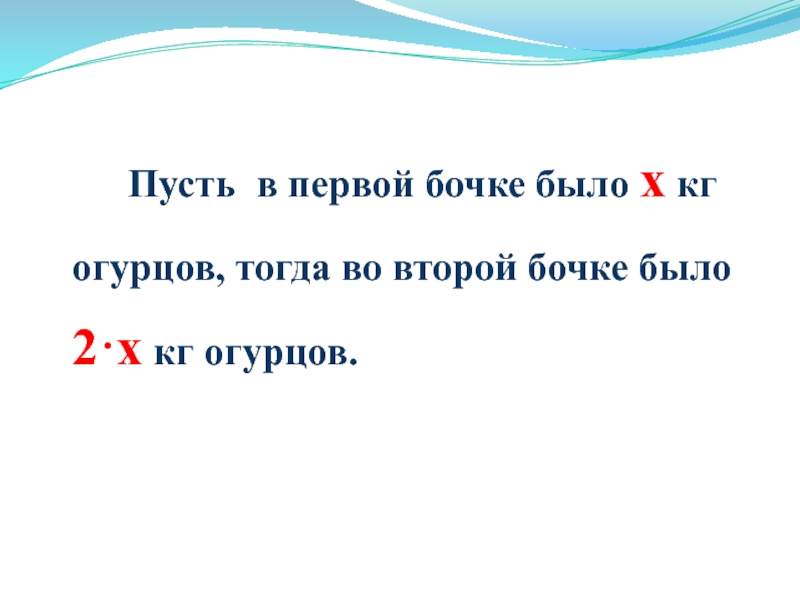 Слайд 9 Пусть в первой бочке было х кг огурцов, тогда во второй