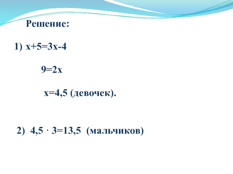 Решение:1)	х+5=3х-4	   9=2х	    х=4,5 (девочек).  2) 4,5  3=13,5 (мальчиков)